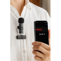 El micrófono corbatero inalámbrico ofrece sonido claro y estable gracias a su tecnología de 2.4 GHz. Su receptor Lightning permite conexión directa sin apps, ideal para grabar desde tu iPhone de manera rápida y profesional. Incluye batería recargable, clip metálico y cable USB para carga.