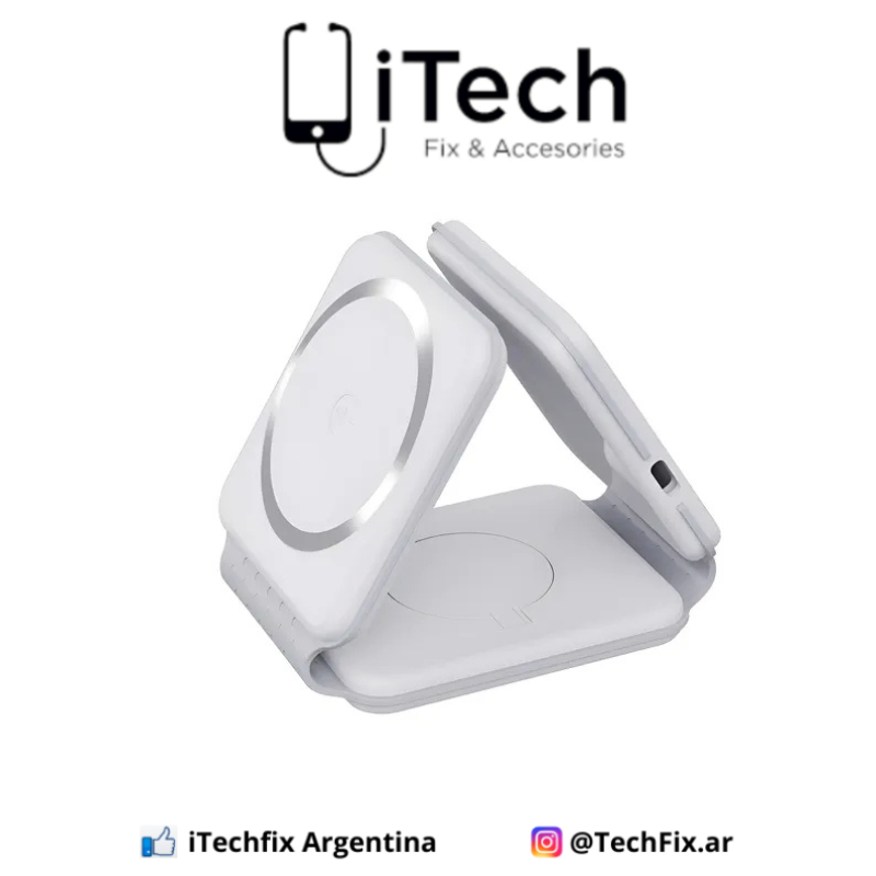 Carga inalámbrica estándar Qi, superficie magnética para mejor sujeción, diseño compacto y estable, capacidad para cargar varios dispositivos a la vez y uso práctico en escritorio o mesa de luz.